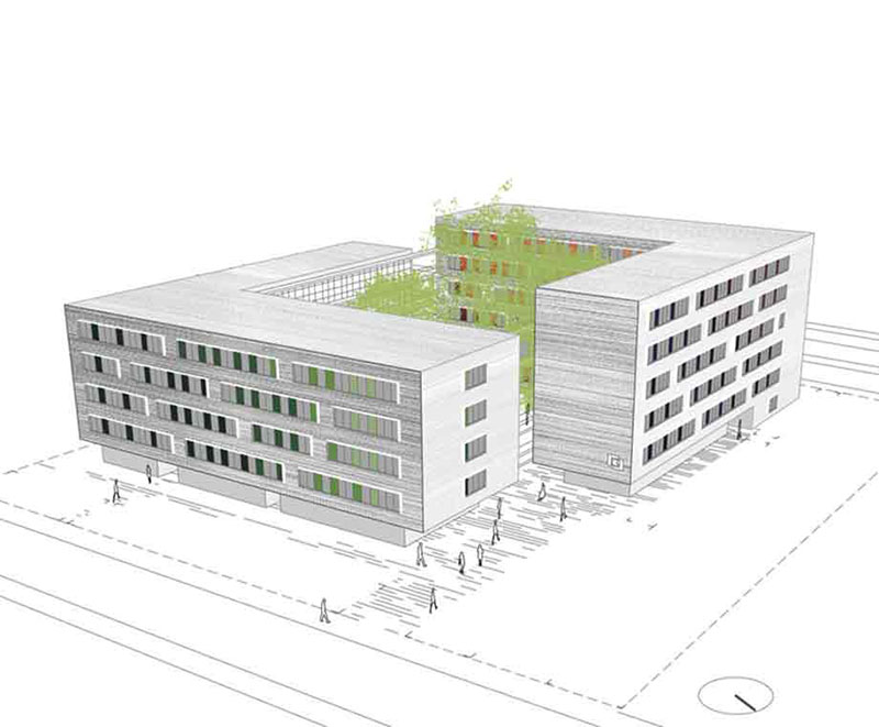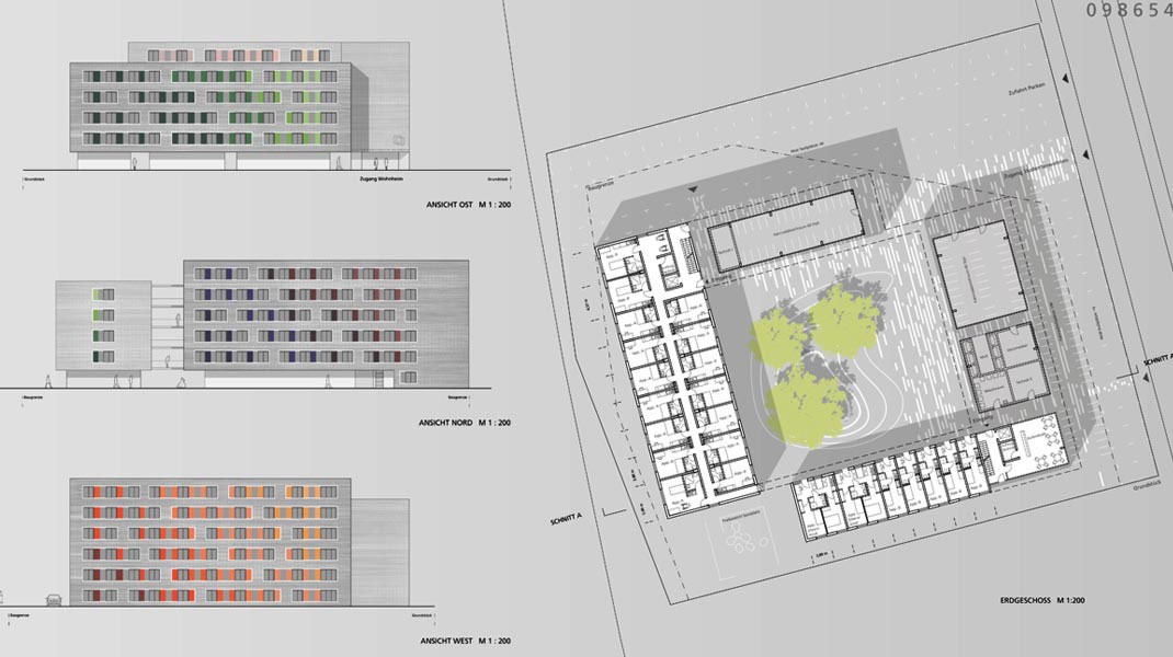 Der Entwurf für das Studentenwohnheim „Universitätsstraße“ besticht durch seine klare Geometrie. Zwei zueinander versetzte Gebäudewinkeln erzeugen einen attraktiven Innenhof als einen Ort eigener Identität in einem Gebiet, das bisher von Industriebrachen geprägt ist. Der grüne, vom umgebenden Lärm geschützte Hof folgt einem Konzept, das durch gekonntes Verzahnen von halböffentlichen Innen- und öffentlichen Außenraum den Studenten einen eigenen Wohncampus anbietet, den sie als ihr Zuhause wahrnehmen können.