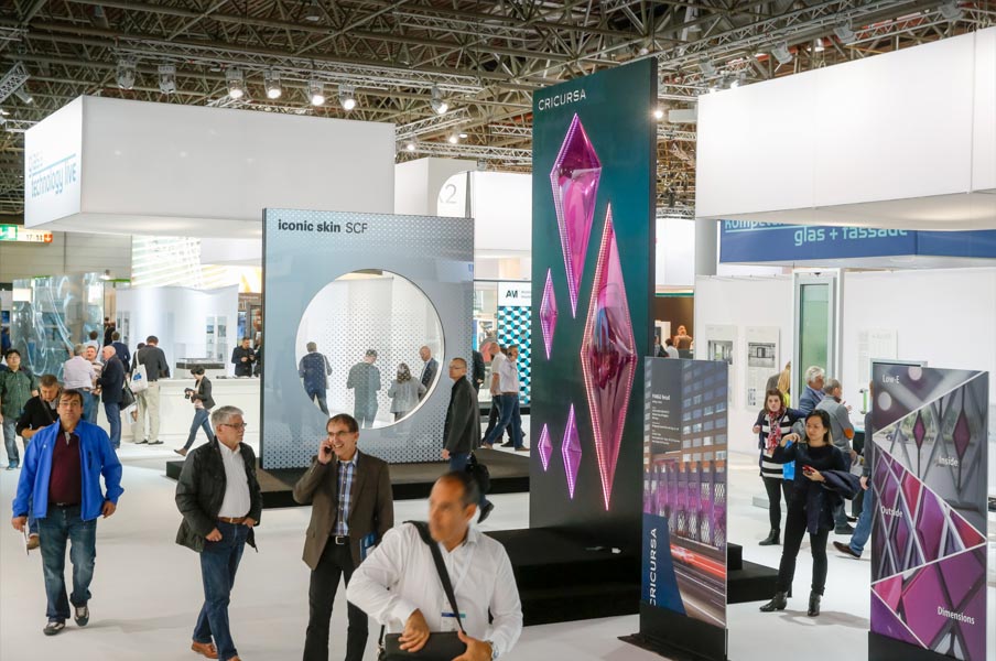 Auf rund 2 500 Quadratmetern werden unter dem Leitthema „Intelligent Glass“ Neuheiten aus den Bereichen Glaskonstruktion und Fassade, Integration modernster Technologien, Produktinnovationen und spektakuläre Glasanwendungen sowie aktuelle Forschungsergebnisse anschaulich präsentiert und dem internationalen Fachpublikum vorgestellt.
