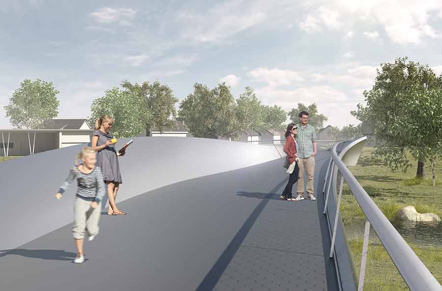 Die neue Fußgängerbrücke stellt eine wichtige Verbindung zwischen den nördlichen Siedlungen und der Innenstadt von Bad Oeynhausen dar. Mit ihrer Lage an den grünen Ufern der Werre und in unmittelbarer Nähe von alten Baumbeständen und Parkanlagen bietet sie einen reizvollen Übergang für Spaziergänger, Jogger und Fahrradfahrer in dem Naherholungsgebiet des Sielparks.