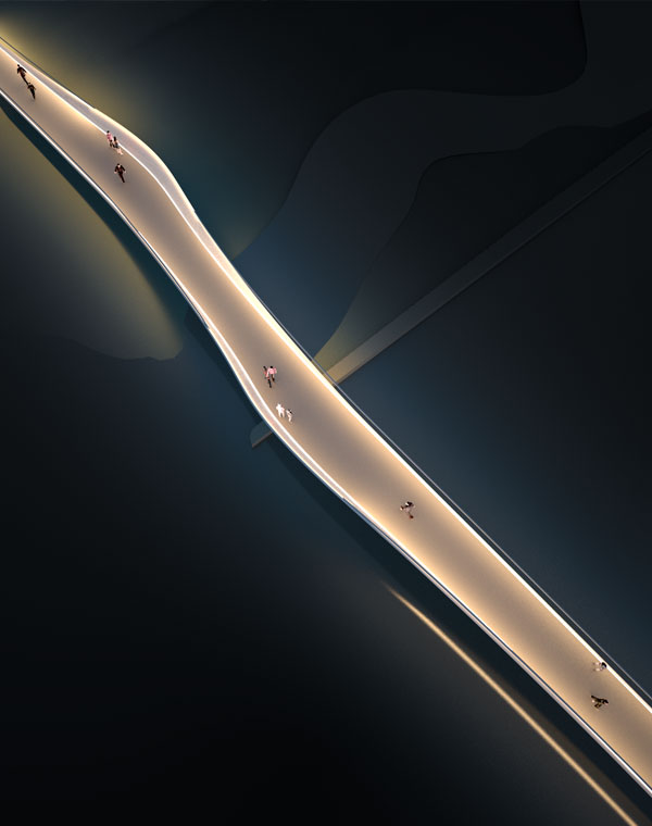 Die Geometrie der Brücke ist einfach und raffiniert zugleich und fügt sich durch ihre geringe und fließende Aufbauhöhe harmonisch in die bestehende Park- und Uferlandschaft ein. Der im Grundriss leicht geschwungene Brückenkörper besteht aus einem geschweißten Stahlkastenholprofil, das aus Einzelblechen zu einem L-förmigen Querschnitt zusammengesetzt wird. Um der Brücke eine filigrane Erscheinung und ihre besondere Form zu geben, werden die vertikalen Teile des Querschnitts mit veränderlichen Höhen ausgeführt und bilden versetzt zueinander sichtbare Finnen im Bereich der Brückenaufweitungen, die zum Anlehnen, ja sogar zum Entspannen einladen.